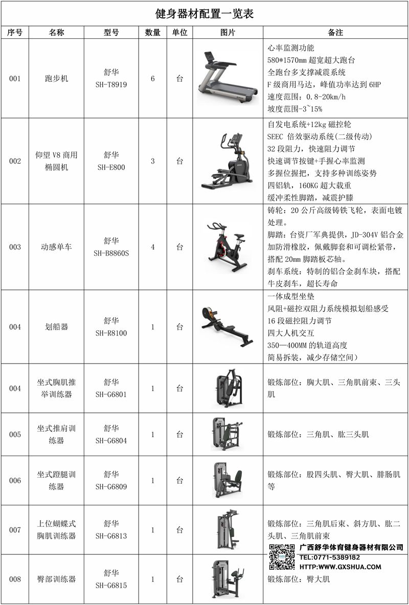 1.米兰V9智能跑步机SH-T8919*6台-独立仪表-简洁大气,全新外观设计,健康运动新选择;心率监测功能,可通过手握心率、无线心率带等不同方式实时采集心率数据;580*1570mm超宽超大跑台-跑感舒适,跑台整体安全稳定;全跑台多支撑减震平台,保证跑台超强支撑力,达到180kg支撑,满足专业健身房需求。F级商用马达-超强马达,AC 3.0HP 交流,峰值功率达到6HP,F级商用品质。速度范围达到0.8-20km/h;V9跑步机可实现跑台扬升功能,坡度范围-3~15%,满足客户不同的锻炼需求。