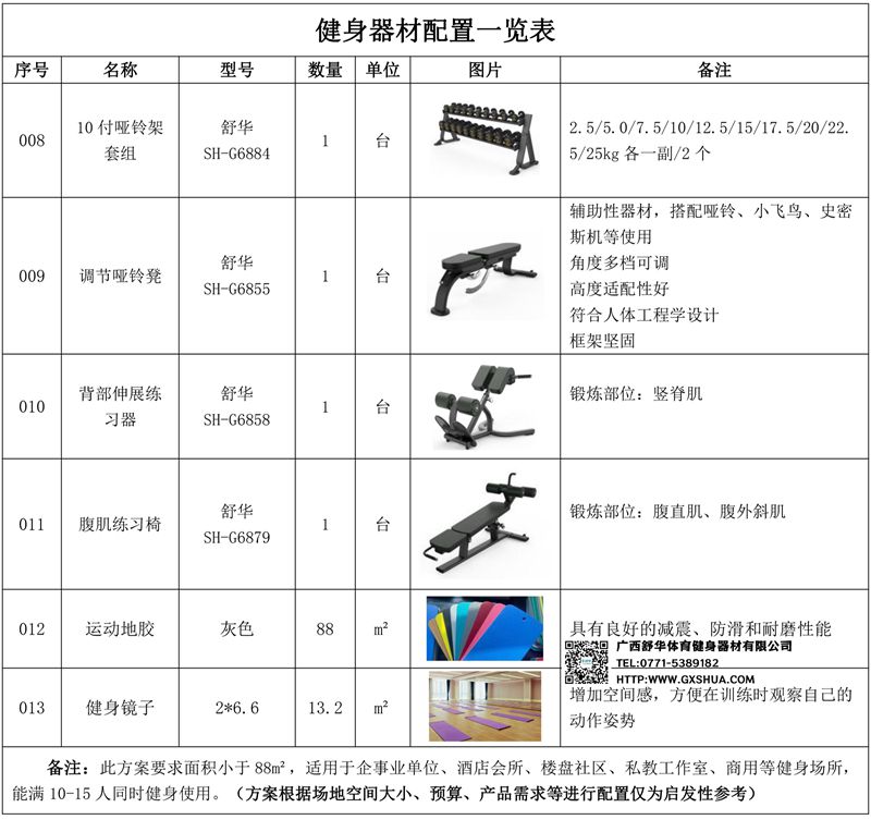 此方案要求面积小于88m²,适用于企事业单位、酒店会所、楼盘社区、私教工作室、商用等健身场所,能满10-15人同时健身使用(方案根据场地空间大小、预算、产品需求等进行配置仅为启发性参考)